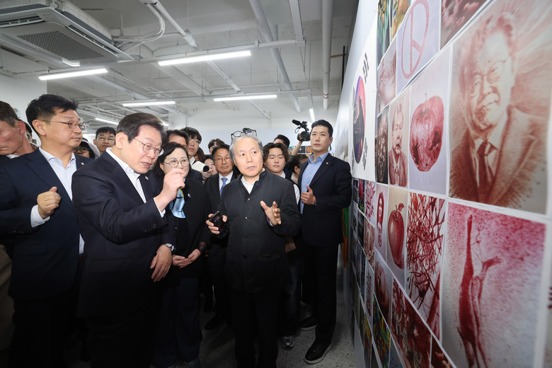 24일 오후 광주 동구 전일빌딩 245에서 더불어민주당 이재명 대선 경선 후보가 내부에 전시된 작품을 둘러보고 있다. 2025.4.24 [공동취재]