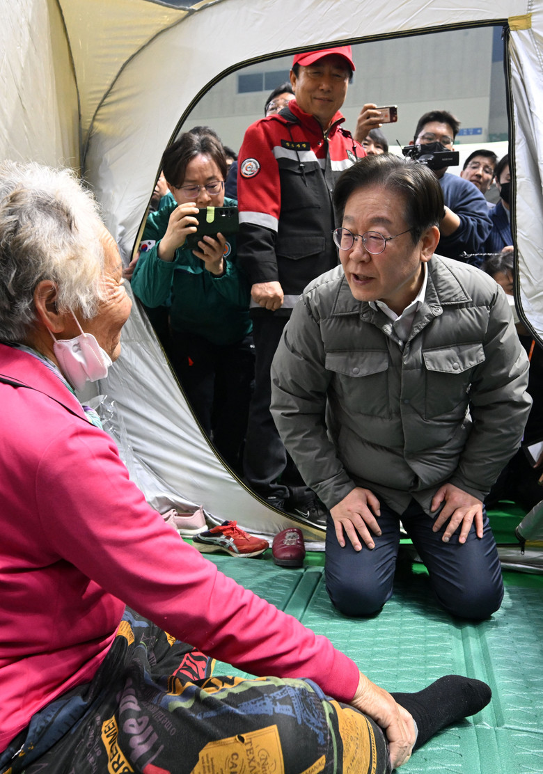 [세계타임즈 = 심귀영 기자] 더불어민주당 이재명 대표가 26일 오후 경북 안동시 안동체육관에 마련된 산불 대피시설을 찾아 이재민을 위로하고 있다. 이 대표는 이날 공직선거법위반 혐의 항소심 무죄 선고 후 첫 일정으로 이곳을 찾았다. 2025.3.26 [공동취재]