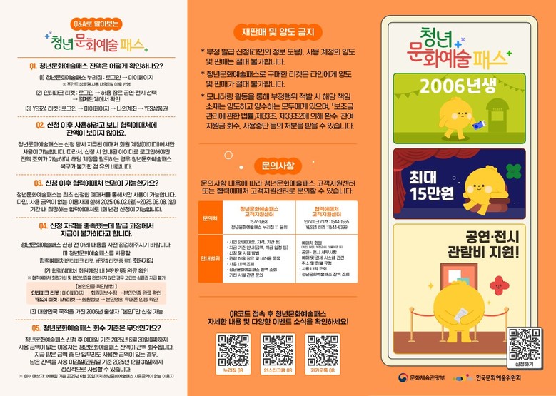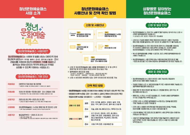 한편, 청년문화예술패스에 대한 문의 사항은 청년문화예술패스 고객지원센터 (☎1577-1968) 또는 청년문화예술패스 누리집을 통해 확인할 수 있다.