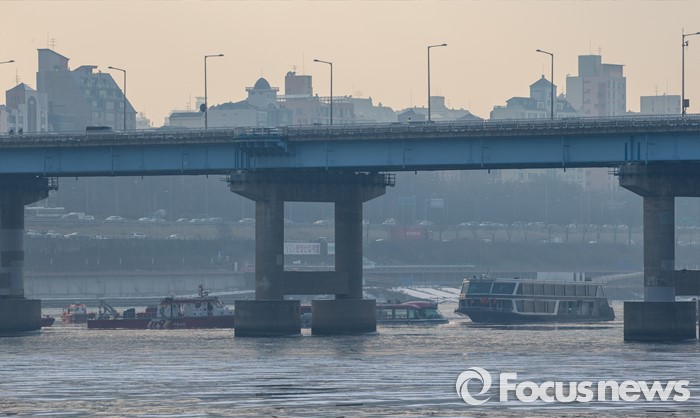 (서울=포커스뉴스) 26일 오후 서울 한강 영동대교 인근을 지나던 한강유람선이 침수, 구조대원들이 구조활동과 견인 작업을 하고 있다.