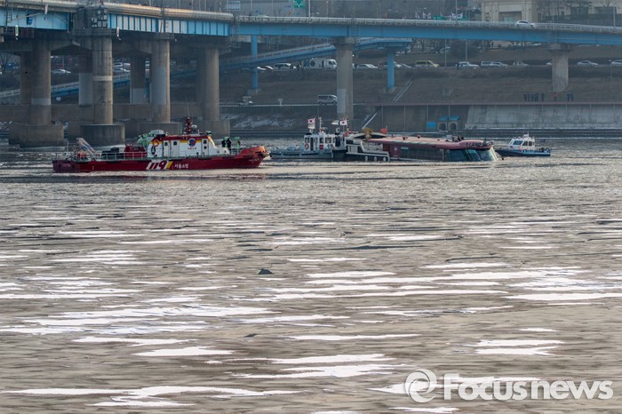 (서울=포커스뉴스) 26일 오후 서울 한강 영동대교 인근을 지나던 한강유람선이 침수, 구조대원들이 구조활동과 견인 작업을 하고 있다.