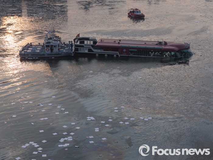 (서울=포커스뉴스) 26일 오후 서울 한강 영동대교 아래에서 소방대원들이 침수된 한강유람선 견인 작업을 하고 있다.