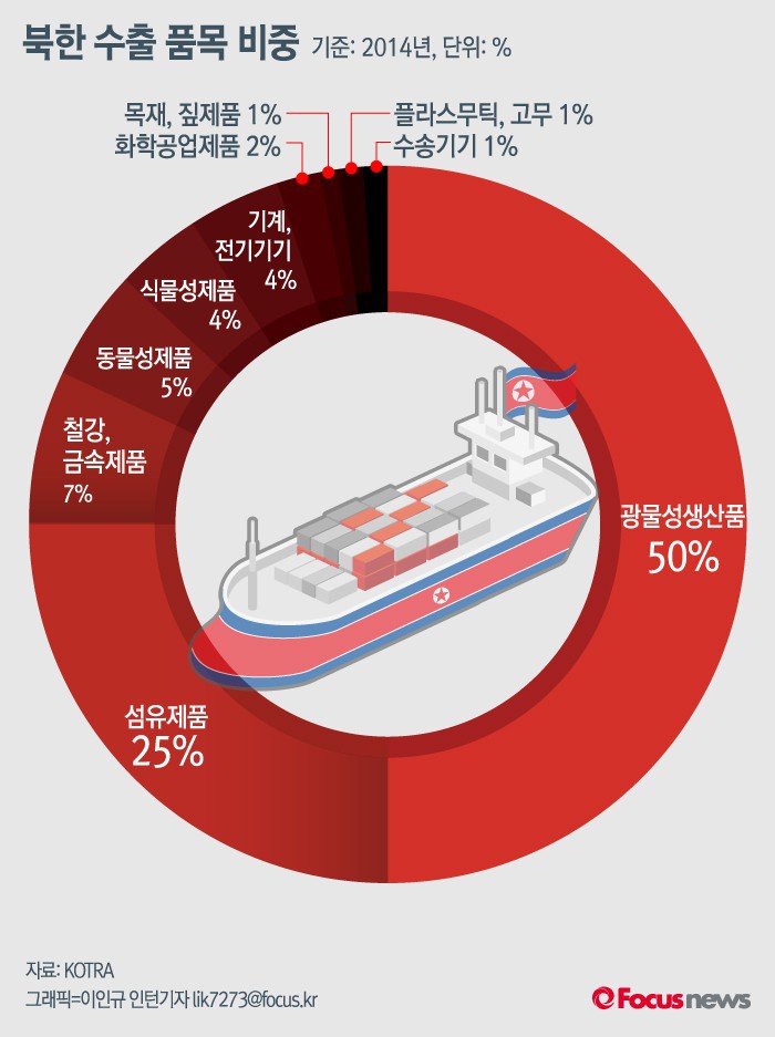 (서울=포커스뉴스) 2014년 북한 수출 품목 비중은 석탄 등 광물성 생산품, 섬유제품, 철강 및 금속제품의 수출이 전체의 81.7%를 점유했다. 특히 석탄 등 광물성 연료가 49.6%로 전체 수출에서 절대적 비중을 차지 했다.