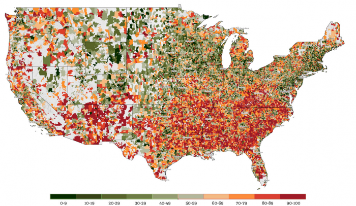 미국 우편번호별 고통지수. 붉을수록 지수가 높다.<자료출처=EIG 홈페이지>