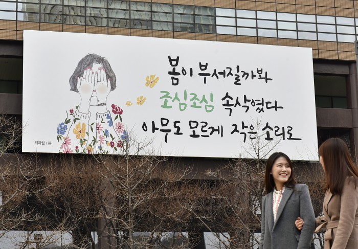 2일 교보생명에 따르면 이번 광화문글판은 최하람 시인의 '봄'에서 가져왔다. '봄이 부서질까봐 조심조심 속삭였다 아무도 모르게 작은 소리로'를 선택, 서로를 배려하고 살자는 메시지를 전달코자했다고 이 회사 측은 설명했다.