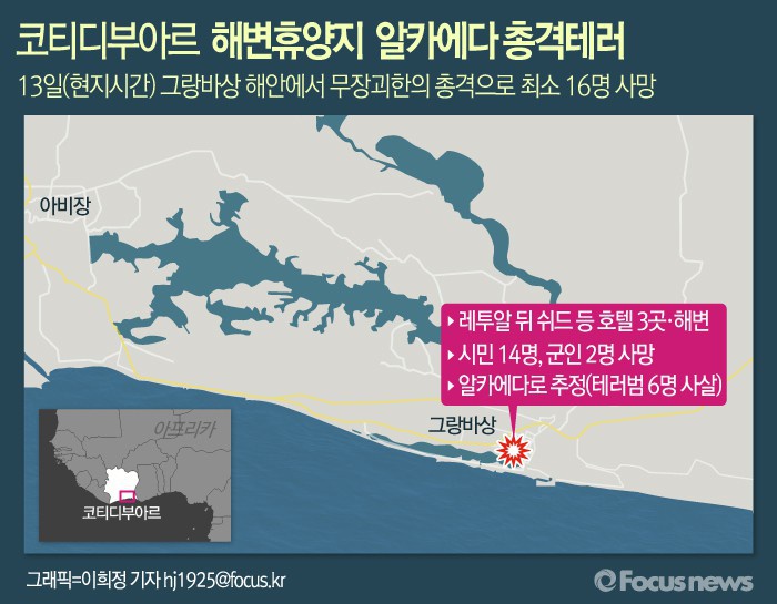 (서울=포커스뉴스) 중국 관영 신화통신은 13일(현지시간) 코티디부아르 해변 휴양지에서 발생한 테러로 시민 최소 14명과 군인 2명이 사망했다고 알라산 우아타라 코티디부아르 대통령이 말했다고 14일 보도했다. 랑바상은 상업 지역인 아비장에서 동쪽으로 40㎞가량 떨어진 곳으로 지역민들과 서양 휴양객들에게 인기가 많은 곳이다.