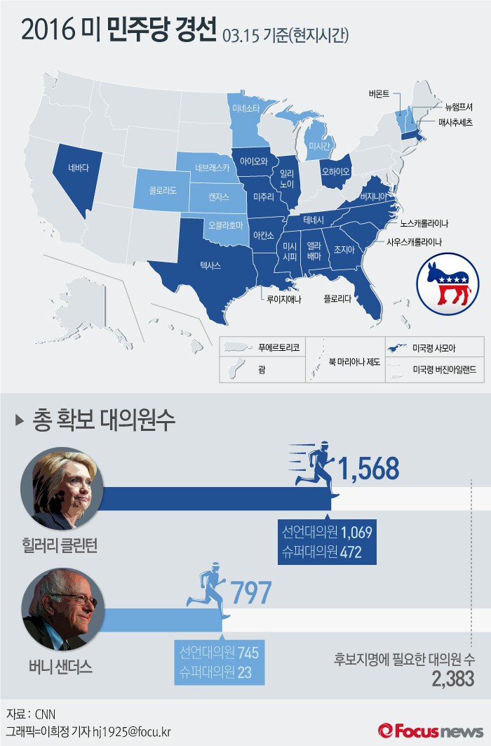 (서울=포커스뉴스) 미국 민주당 대선주자 힐러리 클린턴이 미니슈퍼화요일인 15일(현지시간) 플로리다, 오하이오, 노스캐롤라이나, 일리노이 주 경선에서 모두 승리해 민주당 지명자에 한걸음 더 다가갔다.