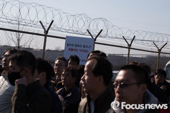 (파주=포커스뉴스) 16일 오후 경기도 파주시 통일대교에서 개성공단 입주기업, 영업기업, 협력기업 등 대표를 비롯한 임직원과 가족들이 공단재가동 및 실질보상을 촉구하며 '개성공단 평화대행진'을 하고 있다.