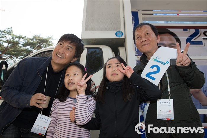 (서울=포커스뉴스) 11일 오후 서울 서대문구 청소년수련관 앞에서 우상호 더불어민주당 서대문구갑 후보가 영화배우 안내상, 우현과 함께 유세를 하고 있다.
