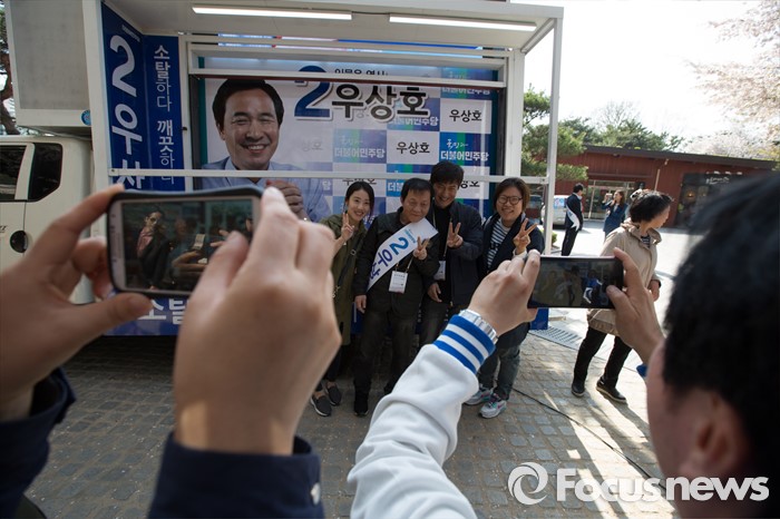 (서울=포커스뉴스) 11일 오후 서울 서대문구 청소년수련관 앞에서 영화배우 안내상, 우현씨가 우상호 더불어민주당 서대문구갑 후보를 지원하기 위해 시민들과 기념촬영을 하고 있다.