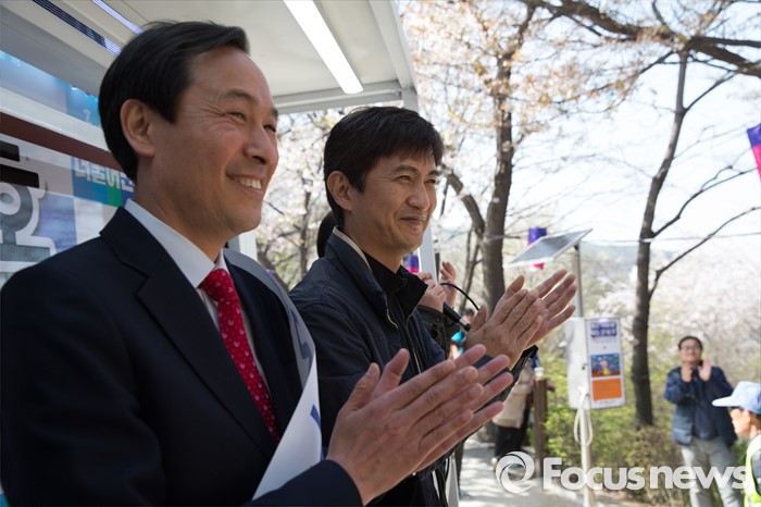 (서울=포커스뉴스) 11일 오후 서울 서대문구 청소년수련관 앞에서 우상호 더불어민주당 서대문구갑 후보가 영화배우 안내상, 우현과 함께 유세를 하고 있다.