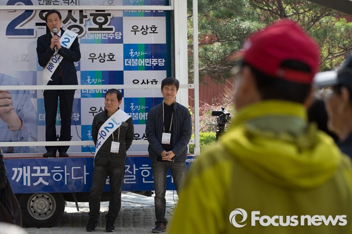 (서울=포커스뉴스) 11일 오후 서울 서대문구 청소년수련관 앞에서 우상호 더불어민주당 서대문구갑 후보가 영화배우 안내상, 우현과 함께 유세를 하고 있다.