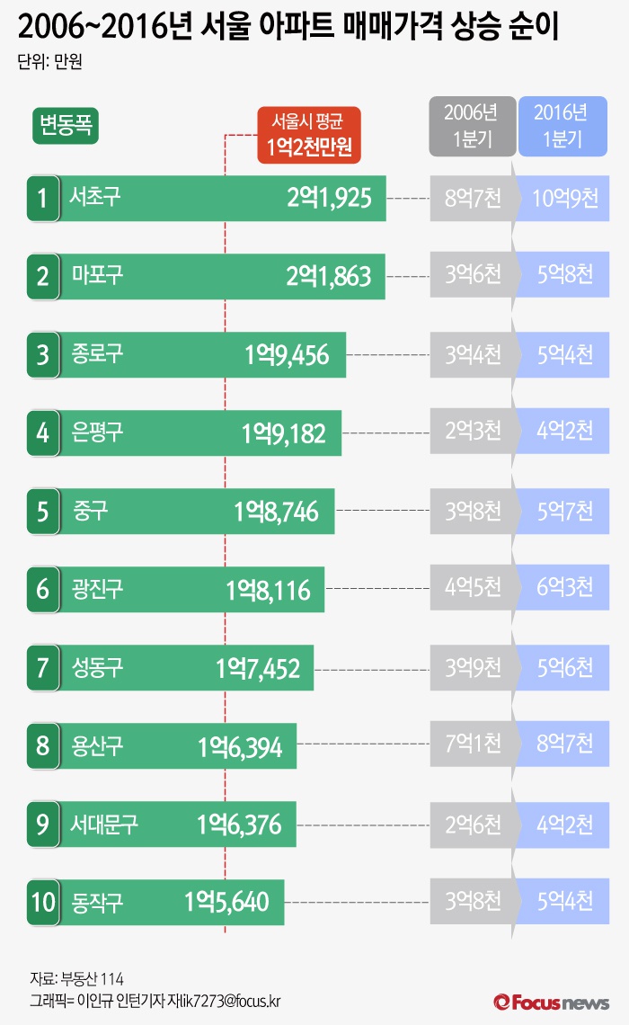 (서울=포커스뉴스) 21일 부동산114에 따르면 지난 10년 동안 서울의 아파트 가격이 평균 1억2000여만원 상승한 것으로 나타났다.