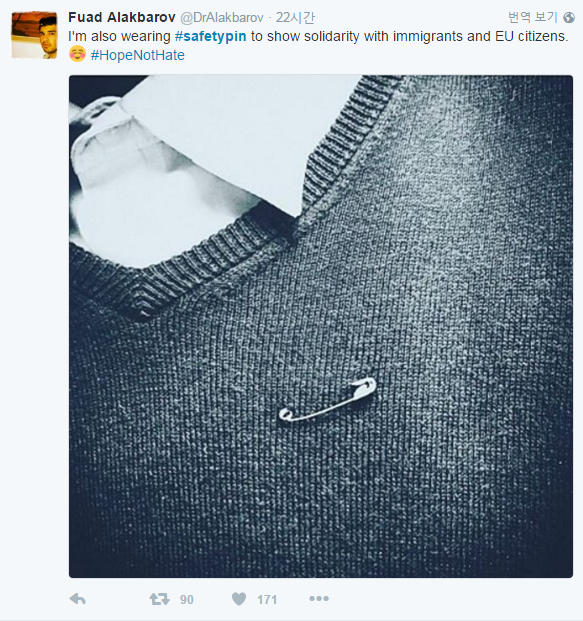 캠페인 홈페이지는 EU 잔류파 영국인 입양을 희망하는 루마니아 가정, 루마니아 가정에서 지내기를 원하는 영국인을 위한 페이지로 나뉘어 있다. '입양하기' 또는 '입양되기' 버튼을 클릭한 루마니아인과 영국인을 페이스북 계정을 통해 연결해준다. 캠페인으로 영국에서 확산되는 이민자 혐오를 비꼰 것이다.(영국/맨체스터=게티/포커스뉴스) 유럽연합 탈퇴(브렉시트·Brexit) 결정 이후 영국 사회는 후회와 분노 그리고 공존을 요구하는 목소리로 혼란스럽다. 영국 맨체스터에 있는 한 가게에서 유럽연합 탈퇴 국민투표를 환영하는 네온사인을 설치해놨다. ⓒ게티이미지/이매진스 (런던/영국=게티/포커스뉴스) 영국의 유럽연합(EU) 탈퇴(브렉시트)에 반대하는 수백명이 시위대들이 피켓을 들고 시위를 하고 있다. 피켓에는 '우리는 EU를 사랑한다' 등 문구가 쓰여 있다. 2016.07.01 ⓒ게티이미지/이매진스 일명 '안전핀(safety pin)운동'은 지난 주말부터 소셜네트워크서비스(SNS)를 통해 급격히 전파되고 있다. 수많은 사람들이 '#safetypin'이라는 해시태그와 함께 옷핀을 착용한 사진을 SNS에 게시하고 있다. <사진 출처=트위터 갈무리>(런던/영국=게티/포커스뉴스) 브렉시트 국민투표 당일, 탈퇴에 찬성하는 지지자가 환하게 웃어보이고 있다. ⓒ게티이미지/이매진스