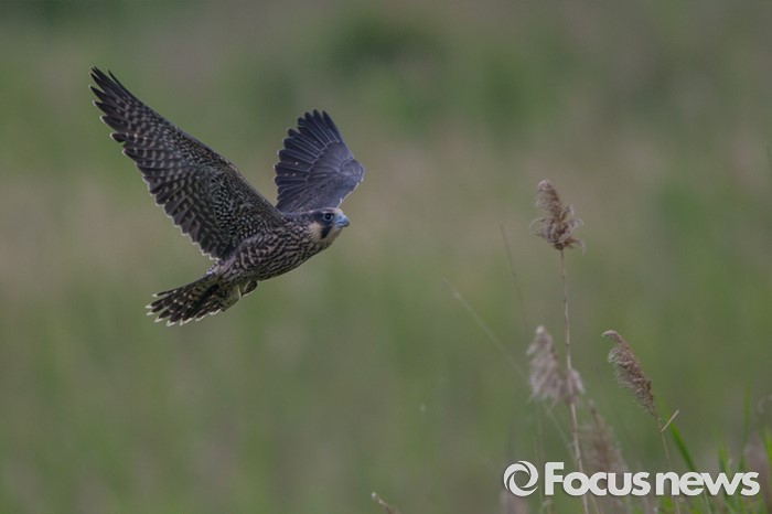 (인천=포커스뉴스) 어린 송골매가 인천시 수도권매립지 풀섶을 얕게 비행하고 있다.