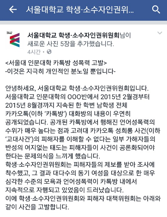 학소위와 대책위는 이날 '서울대 인문대학 카카오톡방 성폭력 고발'이라는 대자보에서 지난해 2월부터 8월까지 약 6개월간 일부 남학생들이 단체 카톡방(단톡방)에서 대다수 동기를 대상으로 언어성폭력과 모욕을 자행했다고 밝혔다.