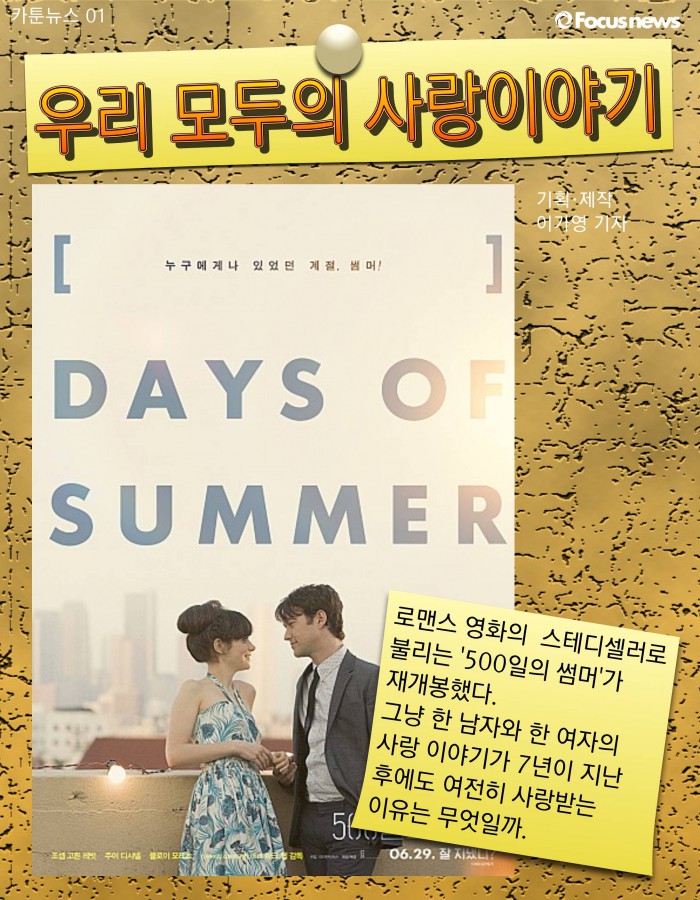 (서울=포커스뉴스) 로맨스 영화의 스테디셀러로 불리는 '500일의 썸머'가 재개봉했다. 그냥 한 남자와 한 여자의 사랑 이야기가 7년이 지난 후에도 여전히 사랑받는 이유는 무엇일까.