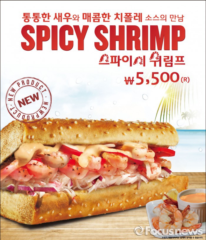 퀴즈노스 코리아에서 한국인의 입맛에 맞춰 독자 개발한 스파이시 쉬림프 샌드위치에는 통새우와 매콤한 치폴레 소스, 양파와 피망이 들어간다. 판매가는 레귤러 사이즈, 화이트 빵 기준 5500원이다.