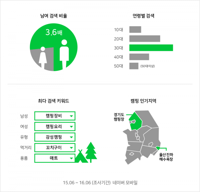 지역별로는 경기도 캠핑에 대한 검색 비중이 가장 높았으며 강원도, 대구, 제주도, 서울이 뒤를 이었다.여름 캠핑 키워드 인포그래픽 <사진제공=네이버>