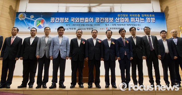 (서울=포커스뉴스) 이우현(가운데) 새누리당 의원과 윤영일(오른쪽 여섯번째) 국민의당 의원을 비롯한 내빈들이 8일 오후 서울 여의도 국회 의원회관에서 열린 공간정보 국외 반출 관련 정책 토론회에 참석해 기념촬영 하고 있다.