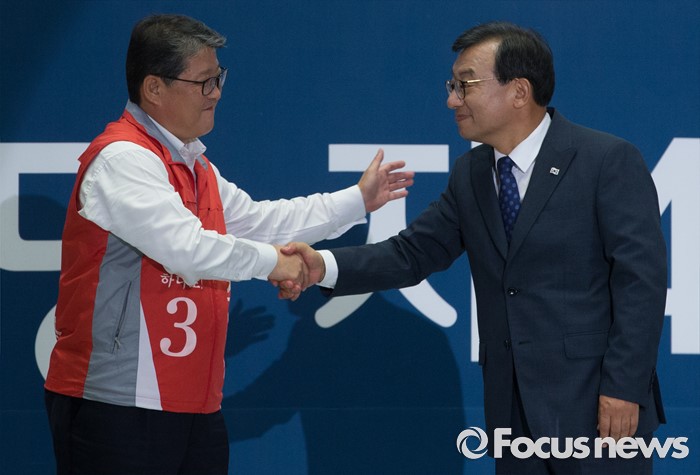(서울=포커스뉴스) 9일 오후 서울 송파구 잠실실내체육관에서 열린 새누리당 4차 전당대회에서 당대표로 선출된 이정현(오른쪽) 의원과 최고위원으로 선출된 조원진 의원이 악수하고 있다.