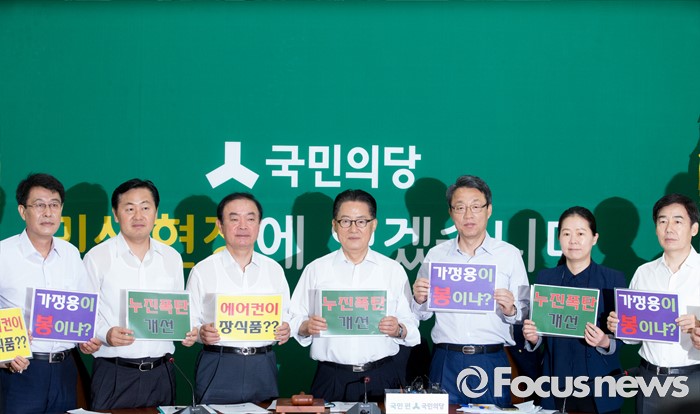 (서울=포커스뉴스) 11일 오전 서울 여의도 국회에서 열린 국민의당 원내정책회의에 참석한 박지원 비상대책위원장과 김성식 정책위의장 등 의원들이 전기요금 누진제 개선을 촉구하는 퍼포먼스를 하고 있다.