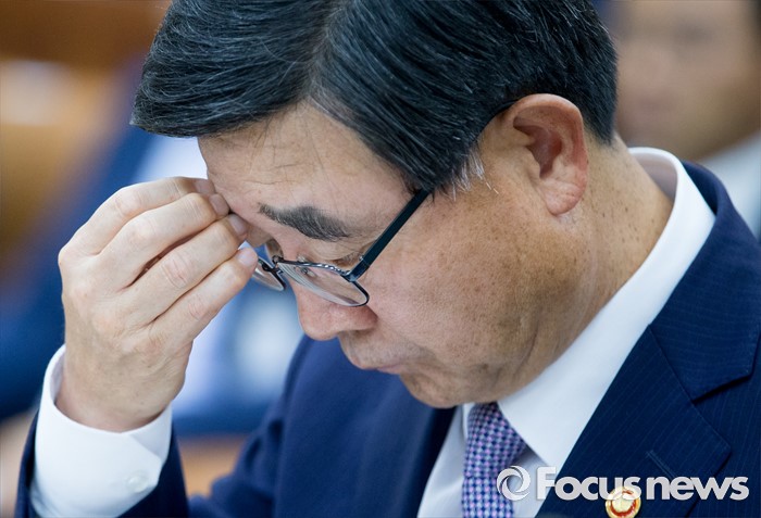 (서울=포커스뉴스) 11일 오후 서울 여의도 국회에서 열린 환경노동위원회 전체회의에 참석한 이기권 고용노동부 장관이 머리를 만지고 있다.