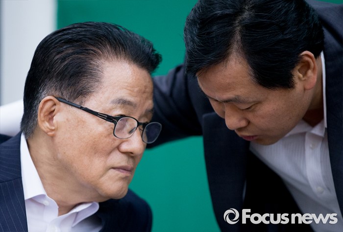 (서울=포커스뉴스) 11일 오후 서울 여의도 국회에서 박지원(왼쪽) 국민의당 비상대책위원장이 이정현 새누리당 대표와의 면담에 앞서 김관영 원내수석부대표와 대화하고 있다.