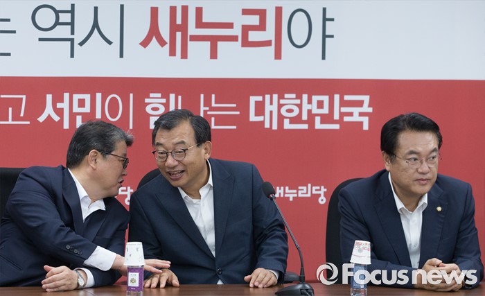 (서울=포커스뉴스) 11일 오후 서울 여의도 국회에서 열린 전기세 누진제 개편 긴급 당정 협의에 참석한 이정현(가운데) 새누리당 대표와 조원진(왼쪽) 최고위원이 대화하고 있다. 오른쪽은 정진석 원내대표.
