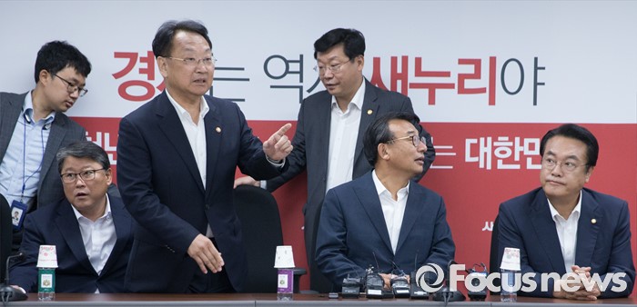 (서울=포커스뉴스) 11일 오후 서울 여의도 국회에서 열린 전기세 누진제 개편 긴급 당정 협의에 참석한 이정현 새누리당 대표, 정진석 원내대표, 유일호 경제부총리 겸 기획재정부 장관, 주형환 산업통상자원부 장관 등 참석자들이 자리를 찾고 있다. 왼쪽 두번째부터 조원진 최고위원, 유 부총리, 주 장관, 이 대표, 정 원내대표.