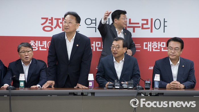 (서울=포커스뉴스) 11일 오후 서울 여의도 국회에서 열린 전기세 누진제 개편 긴급 당정 협의에 참석한 이정현 새누리당 대표, 정진석 원내대표, 유일호 경제부총리 겸 기획재정부 장관, 주형환 산업통상자원부 장관 등 참석자들이 자리를 찾고 있다. 왼쪽부터 조원진 최고위원, 유 부총리, 주 장관(뒤), 이 대표, 정 원내대표.